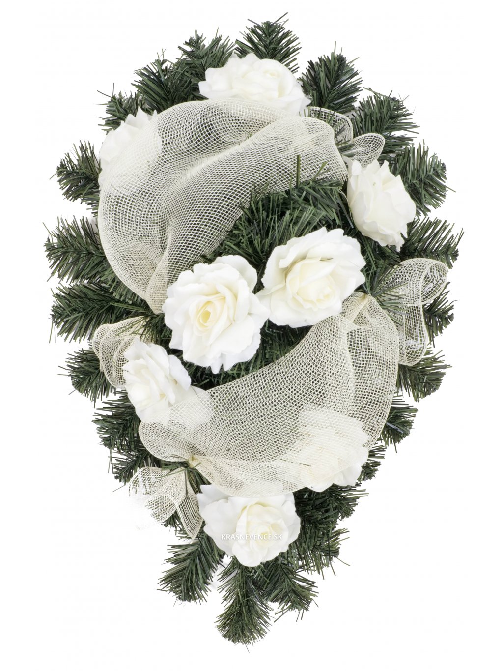 Materiál: kovový základ, umelá smreková čečina, umelé kvety, textilné stuhy